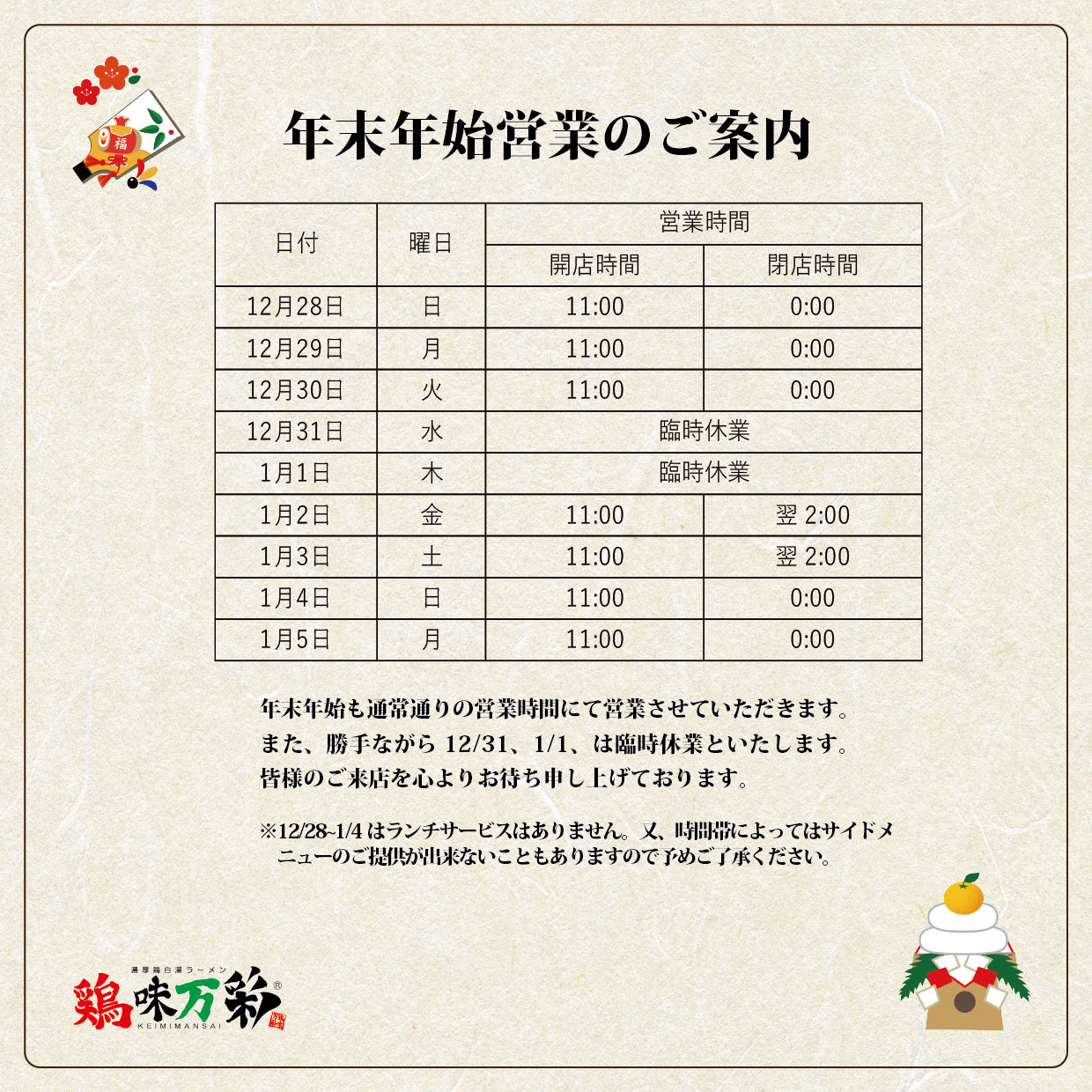 年末年始営業のご案内2025年12月27日年末年始の営業時間についてお知らせいたします。 本年も格別のご愛顧を賜り、誠にありがとうございました。 皆さまの温かいご支援に支えられ、無事に一年を締めくくることができました。 来る年も、より一層ご満足いただける一杯をご提供できるよう努めてまいります。 明年も鶏味万彩をどうぞよろしくお願い申し上げます。 投稿ナビゲーション ← 臨時休業のお知らせ